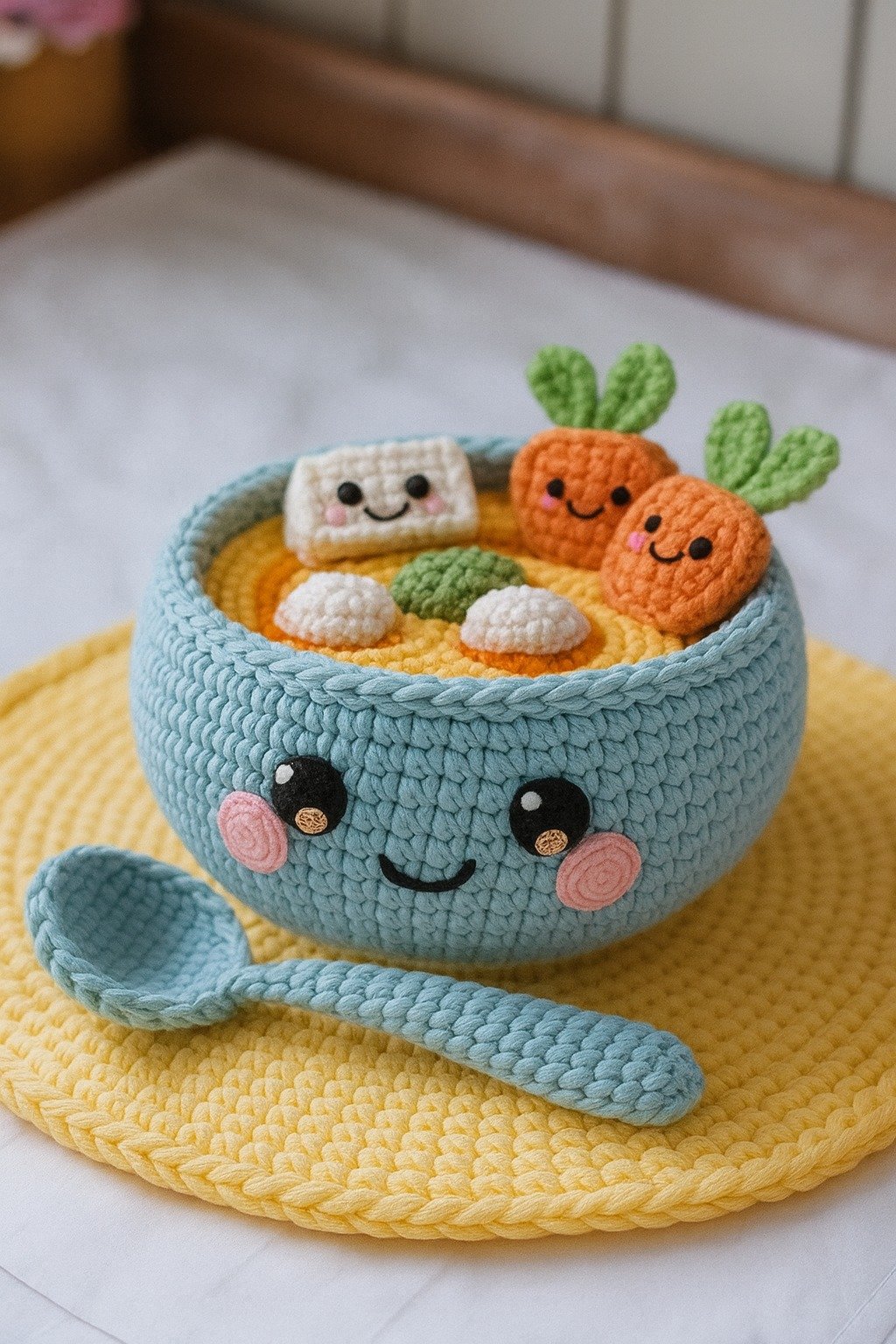 Another use is stress relief. Many people find amigurumi comforting to hold. The squishy stuffing and soft yarn create a tactile experience that brings calmness. Keeping a soup bowl amigurumi on your desk or bedside table can be surprisingly soothing.